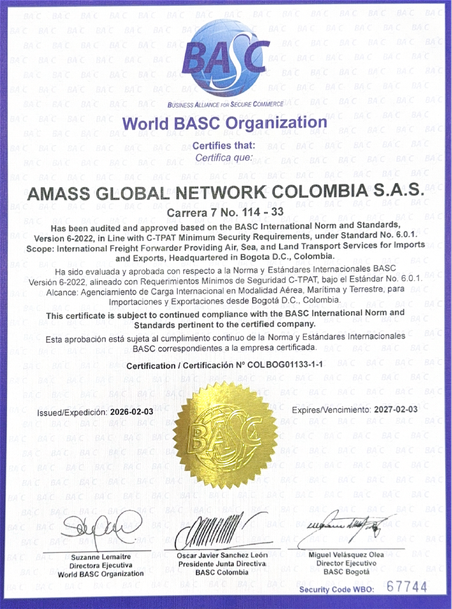 This successful certification is a testament to AMASS Colombia Branch's commitment to deep-rooted local operations. Centered in Bogotá, the company has built a multimodal transport network across Latin America, establishing a fully standardized system across warehousing, transportation, and information flow management. Through measures such as 24/7 surveillance and rigorous risk assessments, AMASS Colombia ensures cargo security while strictly adhering to both international and local compliance requirements. The certification serves as an international endorsement of the company's supply chain security management capabilities.